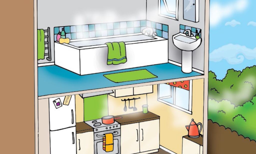 - Kitchens and bathrooms – These rooms need more ventilation when you cook, wash up, bathe or dry clothes. You will need to open windows and use cooker extractor hood or extractor fan, if fitted. They are relatively cheap to run and very effective. Close kitchen and bathroom doors whilst these rooms are in use and for a while afterwards to allow the moisture to be vented to the outside. This will help to reduce the passage of moisture to other parts of your home.